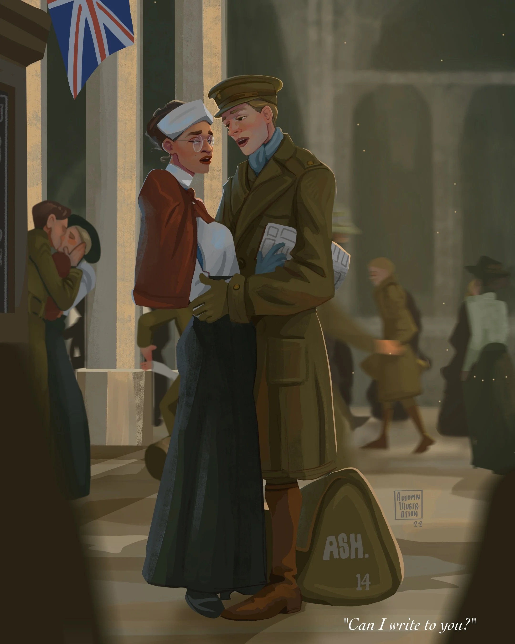 He stands there, excluded from the crowd in his solitude. Couples, families, and clusters of soldiers surround him, yet he stands alone, orbited only by his kit and sleeping bag, swamped in his great tawny trench with his Major’s cap perched atop his fair, downy hair.
