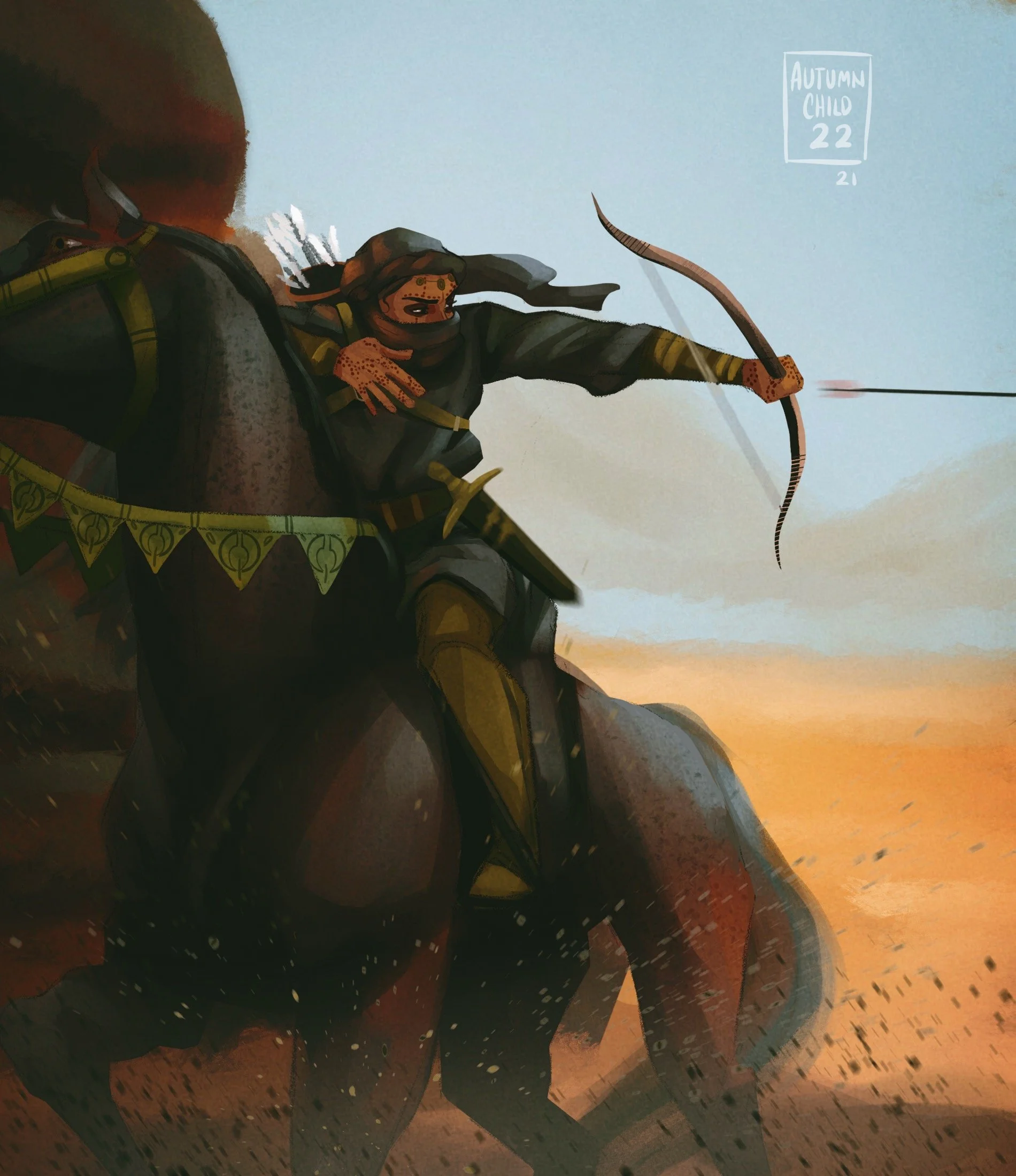When teaching the young prince to ride a horse, it is Tiberias who sees the Sultan’s daughter skirting their activities with covetous eyes. Against his better judgement, he puts her up in a saddle… and is given one of Jerusalem’s swiftest riders in return. Her childhood heroes of fearsome Mongol warriors atop their horses, letting off arrows at impossible speeds, come to life in her. To Baldwin, she is more a Greek Valkyrie from Mythology than merely human anymore.